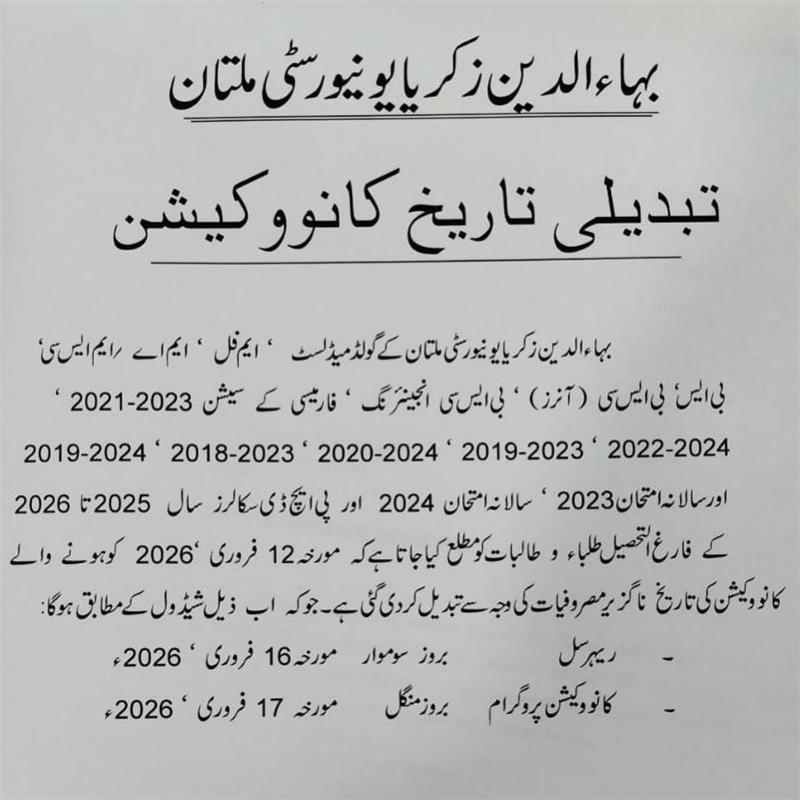 Bahauddin Zakariya University BZU Multan had initially planned to hold its annual convocation on 12-02-2026 for gold medalists and graduates of various programs, including MPhil, MA, MSc, BS, BSc Hons, BSc Engineering, and Pharmacy from the sessions 2018-23, 2019-23, 2019-24, 2020-24, 2021-23, and 2022-24. The convocation also included annual exam pass-outs for 2023 and 2024, as well as PhD scholars for the years 2025 to 2026. However, due to unforeseen circumstances, the originally scheduled event has been cancelled. The students can check the latest information of BZU Multan Announces New Dates for Annual Convocation.