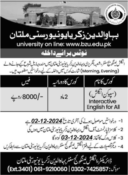 Complete information regarding these admissions in Bahaddin Zakaria University, including the detailed course syllabus, admission requirements, and application process, is available in the advertisement below. Don’t miss this opportunity to boost your spoken English and take a step toward success. Apply now to secure your spot in this valuable program at BZU.