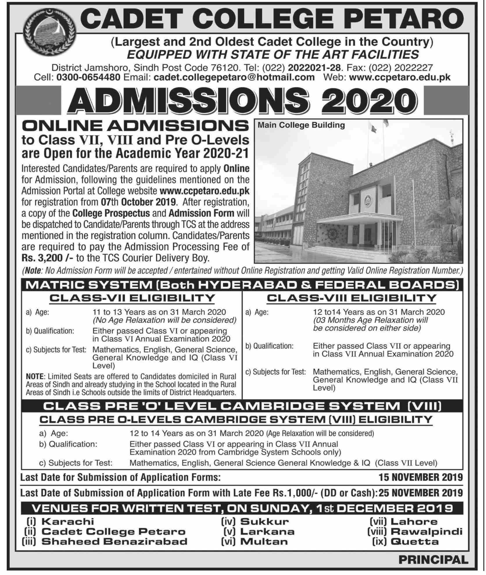 Cadet College Jamshoro has offered admissions for Class 7th, 8th and Pre-O Levels. Last date for submission of admissions applications is 15 Nov 2019. Entry test will be held on 01 Dec 2019.