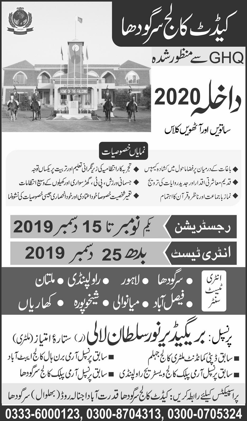Cadet College Sargodha has announced admissions for Class 7th, 8th for session 2020. Last date for submission of admission applications is 15 Dec 2019. Entry test will be conducted on 25 Dec 2019.