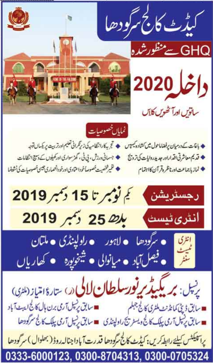 Cadet College Sargodha has announced admissions for Class 7th, 8th for session 2020. Last date for submission of admission applications is 15 Dec 2019. Entry test will be conducted on 25 Dec 2019. Affiliated with GHQ.