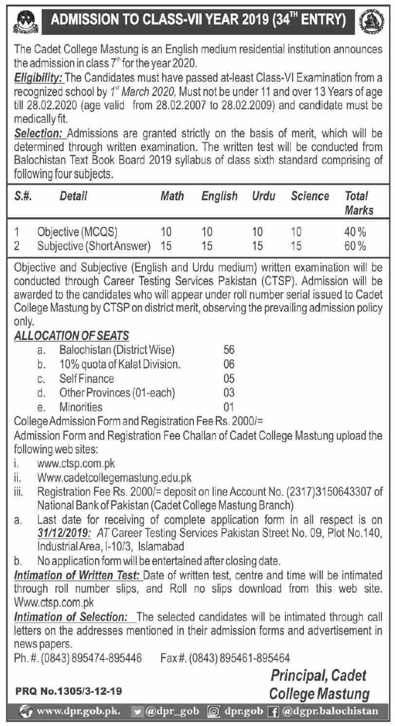 Cadet College Mastung has announced admissions for Class 7th. Last date for submission of admission applications is 31 Dec 2019. For Entry Test date, You can visit college's website.