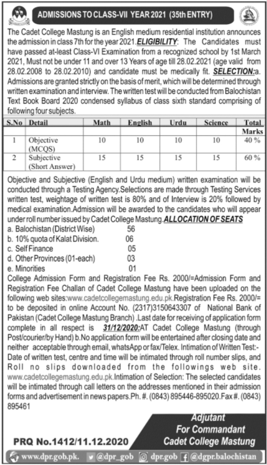 Cadet College Mastung has announced admission for Class 7th for session 2021. Last date for submission of admission applications is 31 Dec 2020. Admissions are open.