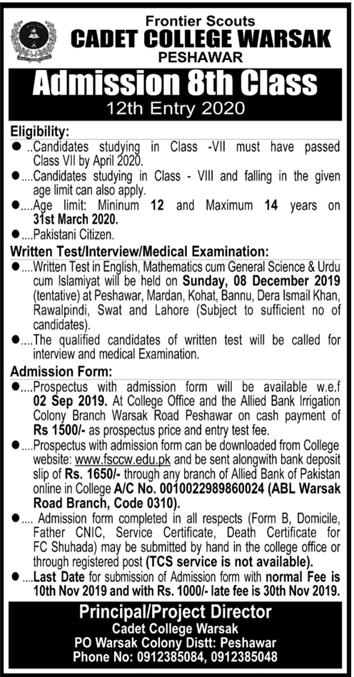 Cadet College Warsak Peshawar has announced admissions for Class 8th. Entry test will be held on 08 Dec 2019. Last date to apply is 10 Nov 2019.