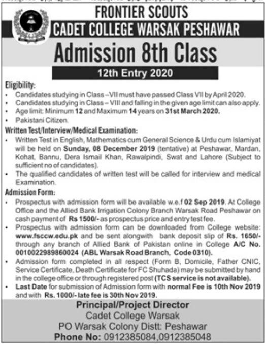Cadet College Warsak Peshawar has announced admissions for Class 8th. Last date to apply 10 Nov 2019. Entry test 08 Dec 2019.