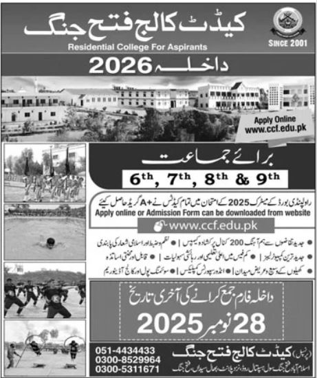 Cadet College Fateh Jang Admissions 2025 Class 9th