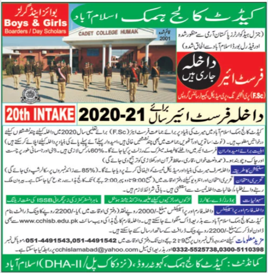 Cadet College Humak is offering admissions 2020 in Intermediate Part I F.Sc Pre Engineering, F.Sc Pre Medical, ICS, ICS Computer Science for Boys and Girls in Islamabad.