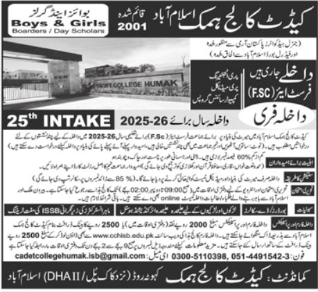 Cadet College Humak Islamabad Admissions 2025 1st Year