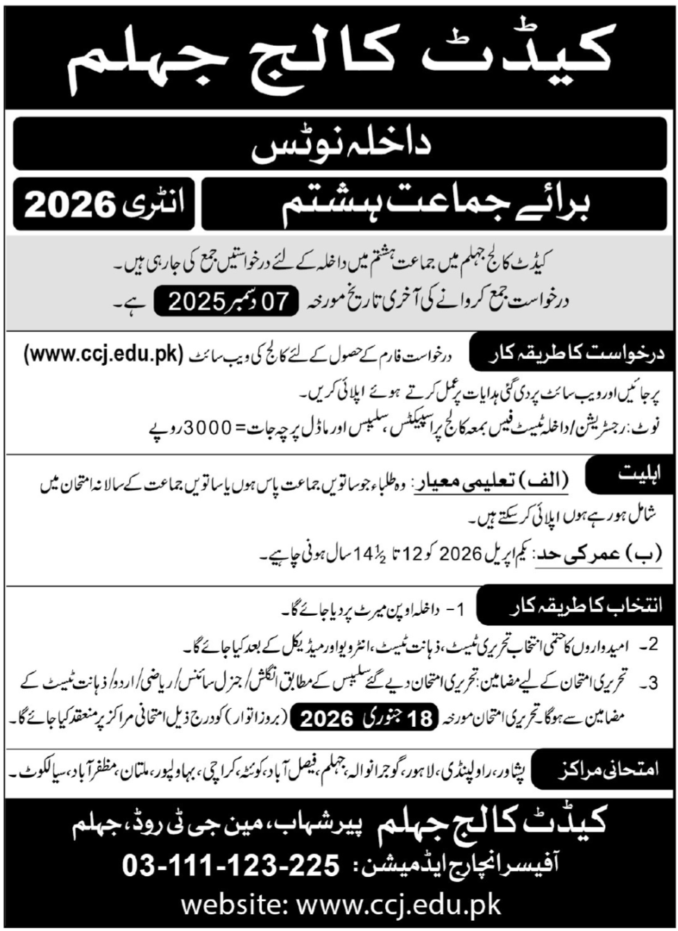 Cadet College Jhelum admission open to Class 8 for the Entry 2026 session. Aspiring candidates are encouraged to apply and become part of a legacy of excellence, discipline, and national service.Eligibility Criteria