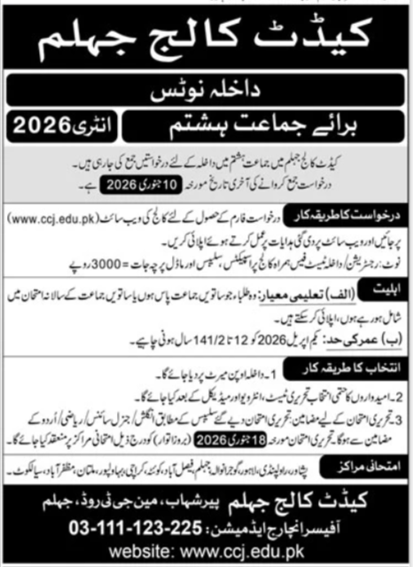 Cadet College Jhelum is now accepting applications for admission to Class 8 for the 2026 session. Interested candidates are encouraged to apply before the deadline: 10 January 2026.