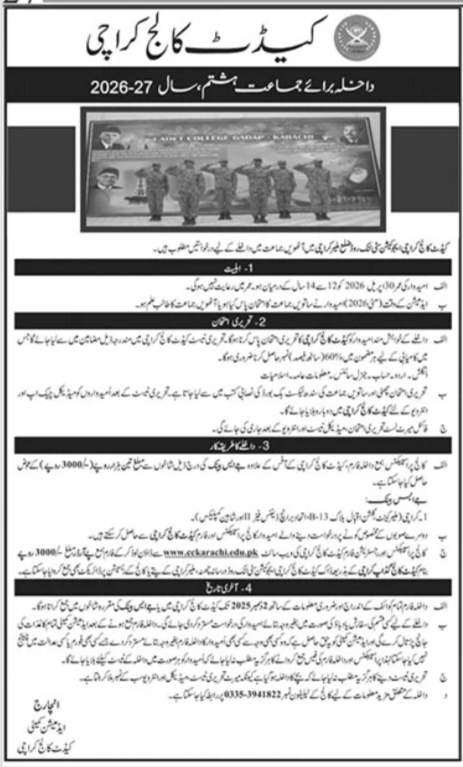 Cadet College Karachi, located in Education City, Link Road, District Malir, invites applications for admission to Class VIII 8th Grade for the Academic Session 2026–27. The college offers a disciplined environment, high-quality academics, and character-building education based on merit.