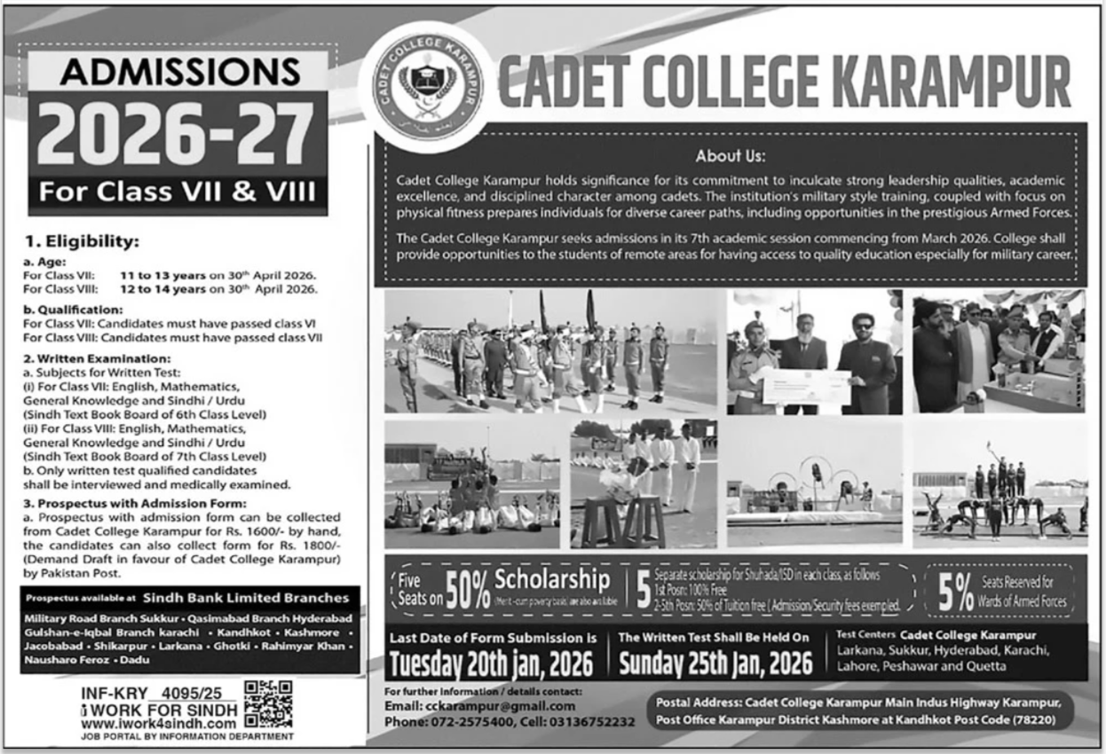 Cadet College Karampur invites bright and disciplined students to apply and take the first step toward a future of leadership, excellence, and service. Don’t miss the opportunity to join one of Sindh’s premier institutions for quality education and military training.