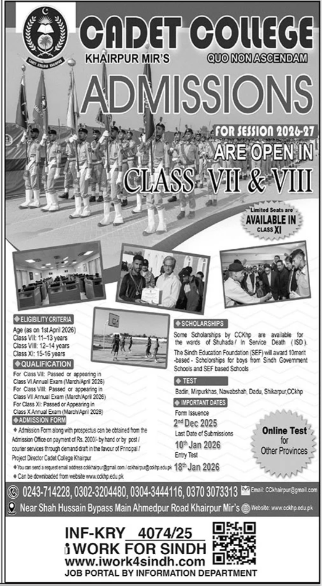 Cadet College Khairpur invites applications for admissions in Class VII, VIII, and limited seats in Class XI for the session 2026-27.