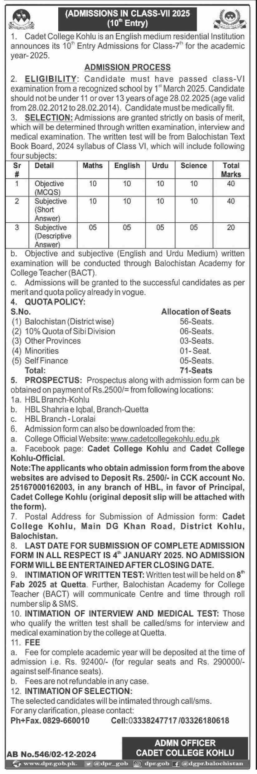 Cadet College Kohlu CCK is now accepting applications for Class VII Admissions for the Session 2025. Aspiring cadets have the opportunity to join one of the most prestigious educational institutions, known for academic and character-building excellence.