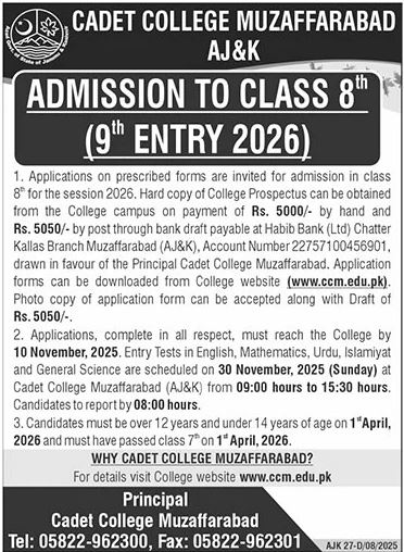 Cadet College Muzaffarabad, a premier residential institution in Azad Jammu & Kashmir, is now accepting applications for admission to Class 8th for the academic session 2026. If youre looking for an education that combines academic excellence, discipline, leadership training, and physical development, Cadet College Muzaffarabad offers a life-changing opportunity.