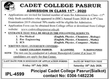 Cadet College Pasrur Admission 2020 announced for the class of 1st year pre medical, pre engineering, ICs.The Last date of Submission of Application form is 10th July, 2020.