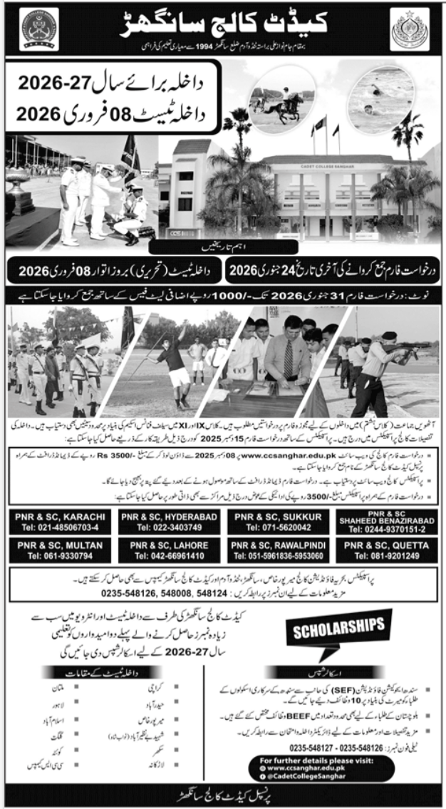Cadet College Sanghar, located near Jam Nawaz Ali, Tando Adam, District Sanghar, has been providing quality education since 1994. The college is now accepting applications for admission to Class 8 Session 2026-27. The entrance test is scheduled for Sunday, 8 February 2026.