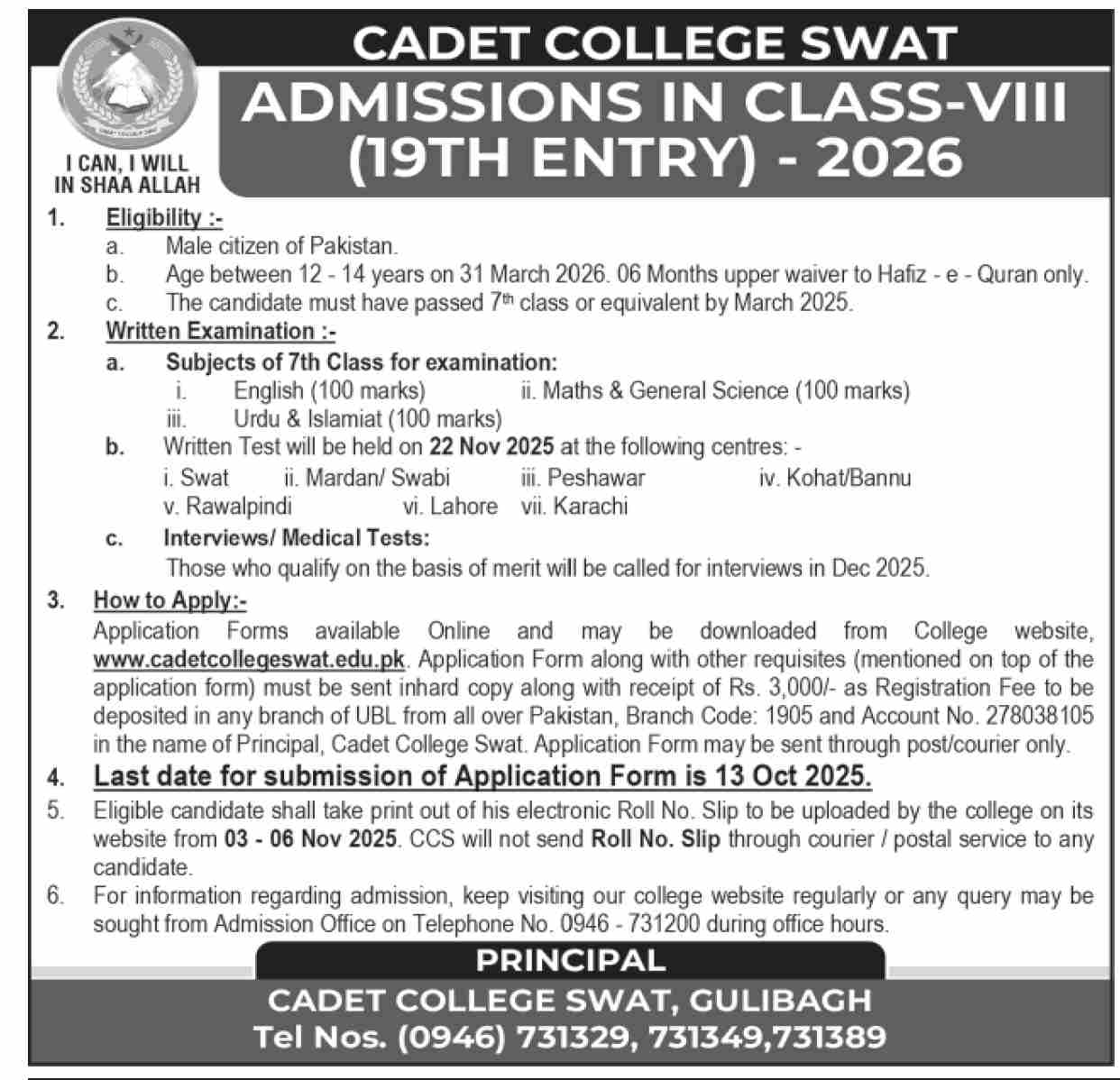 Cadet College Swat Admissions are now open Class VIII 8th for its 19th Entry 2026. Eligibility Criteria: