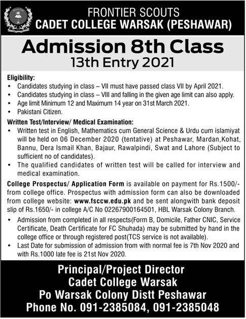 Cadet College Warsak 8th Class Admissions 2020