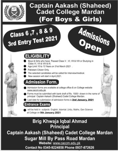 Captain Aakash Cadet College Mardan has offering the admission 2021 for 6th, 7th, 8th and 9th Class. The last date for submission of application forms is 02 January 2021. The entrance exam will be held on 09 January 2021.