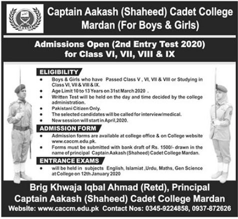 Captain Aakash Shaheed Cadet College Mardan has announced 2nd Entry Test 2020 for Class 6th, 7th, 8th, 9th. Entrance exams will be held in subjects English, Islamyat, Urdu, Mathematics, Gen.Science at college on 12 Jan 2020.