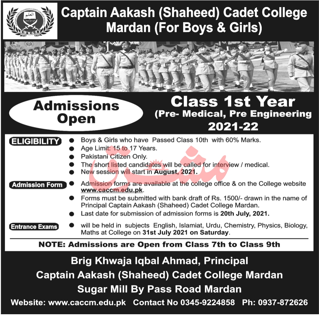 Captain Akash Shaheed Cadet College Mardan For Boys and Girls is looking for Applications for Admissions in Intermediate Pre-Medical, Pre-Engineering for Academic Session 2021. Entrance Test will be held in July 31, 2021. Last date for submission of Applications is July 20, 2021. Admissions are open from class 7th to Class 9th.