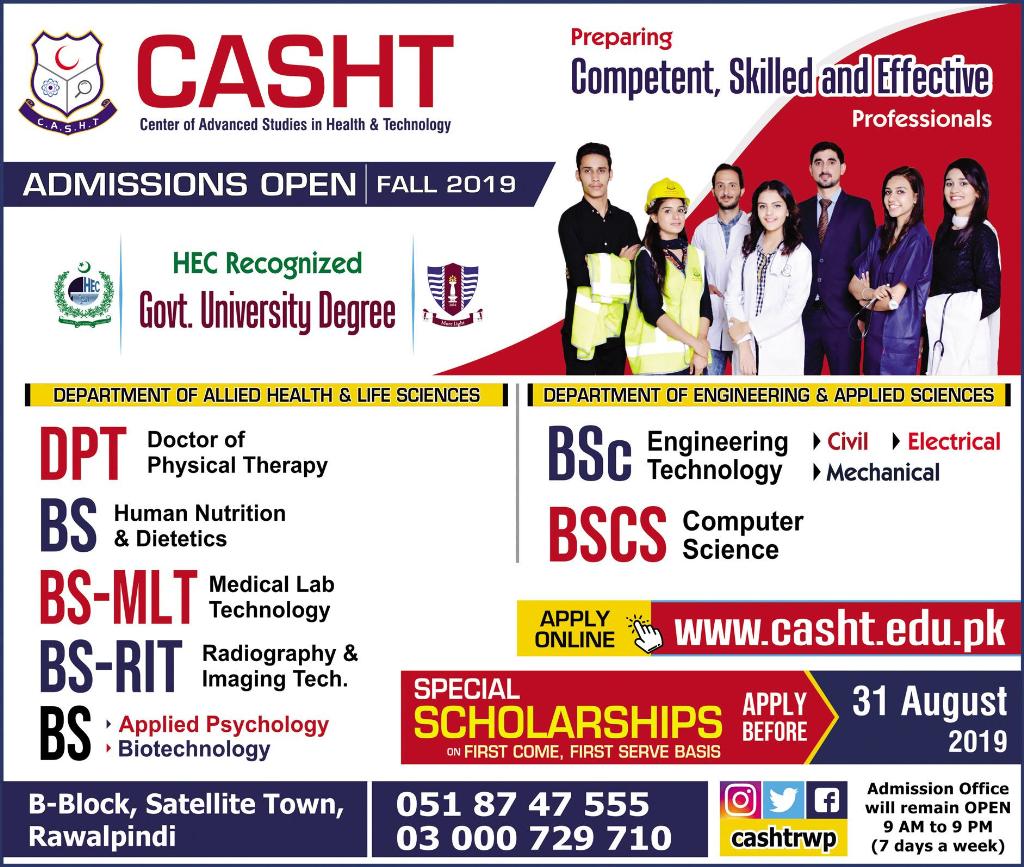 Center of Advance Studies in Health & Technology Rawalpindi has announced admissions for BS in Human nutrition & Dietetics, Medical Lab Technology, Radiology & Imaging Technology, Applied psychology, Biotechnology, Computer science, DPT, BSc in Civil, Electrical, Mechanical Engineering. Last date 31 Aug 2019. Scholarships are available.
