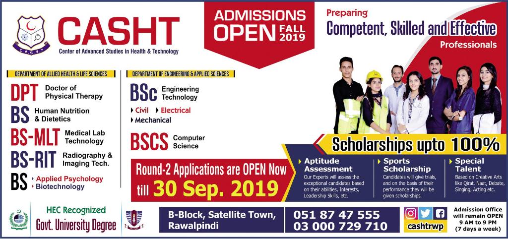 Center of Advanced Studies in Health & Technology Rawalpindi has announced admissions for BS in Human Nutrition & Dietetics, Medical Lab Technology, Applied Psychology, Computer science, BSc in Civil Engineering, Electrical Engineering, Mechanical Engineering, DPT Doctor of Physical Therapy. Scholarships are available.