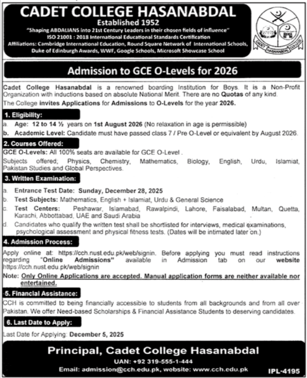 Cadet College Hasanabdal CCH, a prestigious and historic all-boys residential institution, invites applications for admission to GCE O-Level for the academic year 2026. As a non-profit, merit-based institution, CCH selects students solely on national merit, with no quotas of any kind.