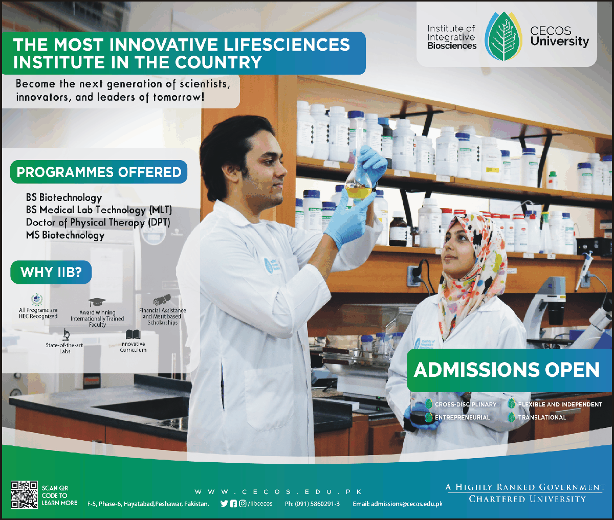 Peshawar, CECOS University institute of integrative bioscience has declared admission fall 2019. CECOS offered admissions in BS biotechnology, BS Medical Lab Technology, Doctor of physical therapy, MS Biotechnology.