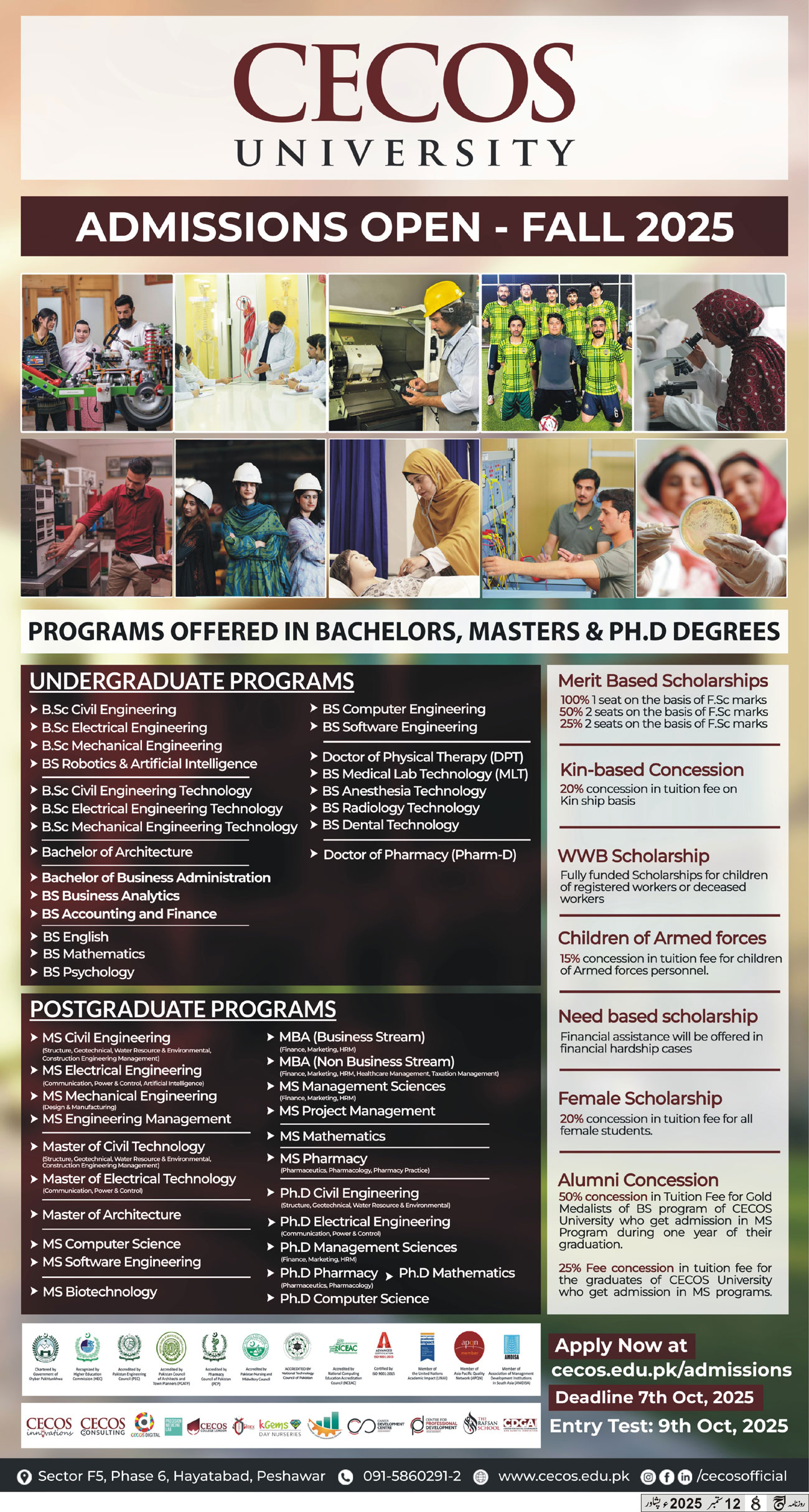 CECOS University, a pioneer in higher education and innovation since its establishment, proudly announces Fall 2025 admissions for Bachelor’s, Master’s, and Ph.D. programs in a wide range of disciplines. Join a campus that’s recognized for its academic excellence, global affiliations, scholarships, and a future-focused learning environment.