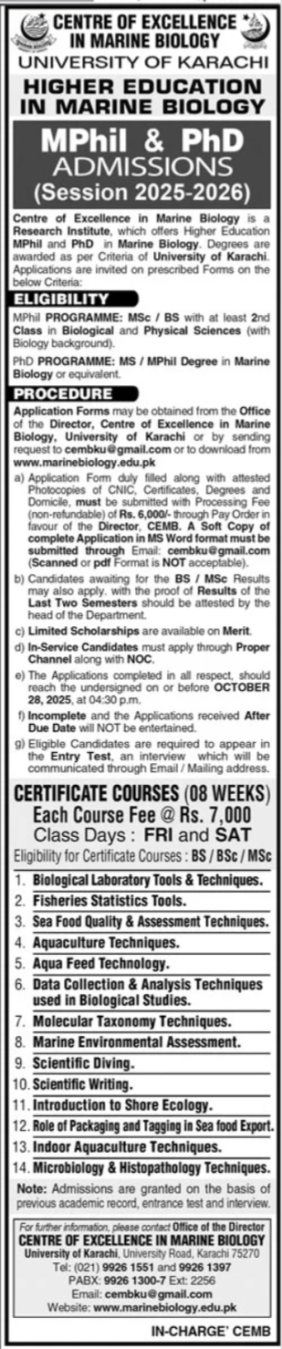 The Centre of Excellence in Marine Biology CEMB at the University of Karachi UoK, a renowned research institution, invites applications for admission 2025 to its MPhil and PhD programs in Marine Biology.