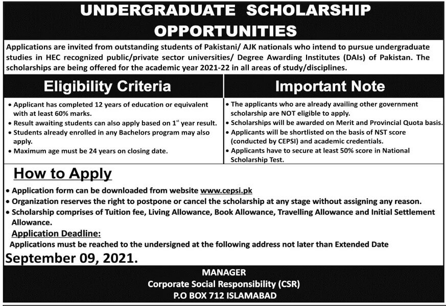 CEPSI has announced to offers the undergraduate scholarships to the AJK and Pakistani nationals who wants to get undergraduate level education in public and private sector universities across the country. The CEPSI Undergraduate Scholarship Program 2021 is offered for the session 2021-22 for all areas of study/discipline. The candidates having 12 year of education or equivalent with at least 60% marks are eligible to apply. The result awaiting students can also apply for scholarship on the basis of 1st year result. The applicants are informed that they must have to secure at least 50% score in National Scholarship test. The candidates are advised to visit the official website of CEPSI to apply for CEPSI Scholarships 2021. The last date to apply for scholarships is 9th September 2021.