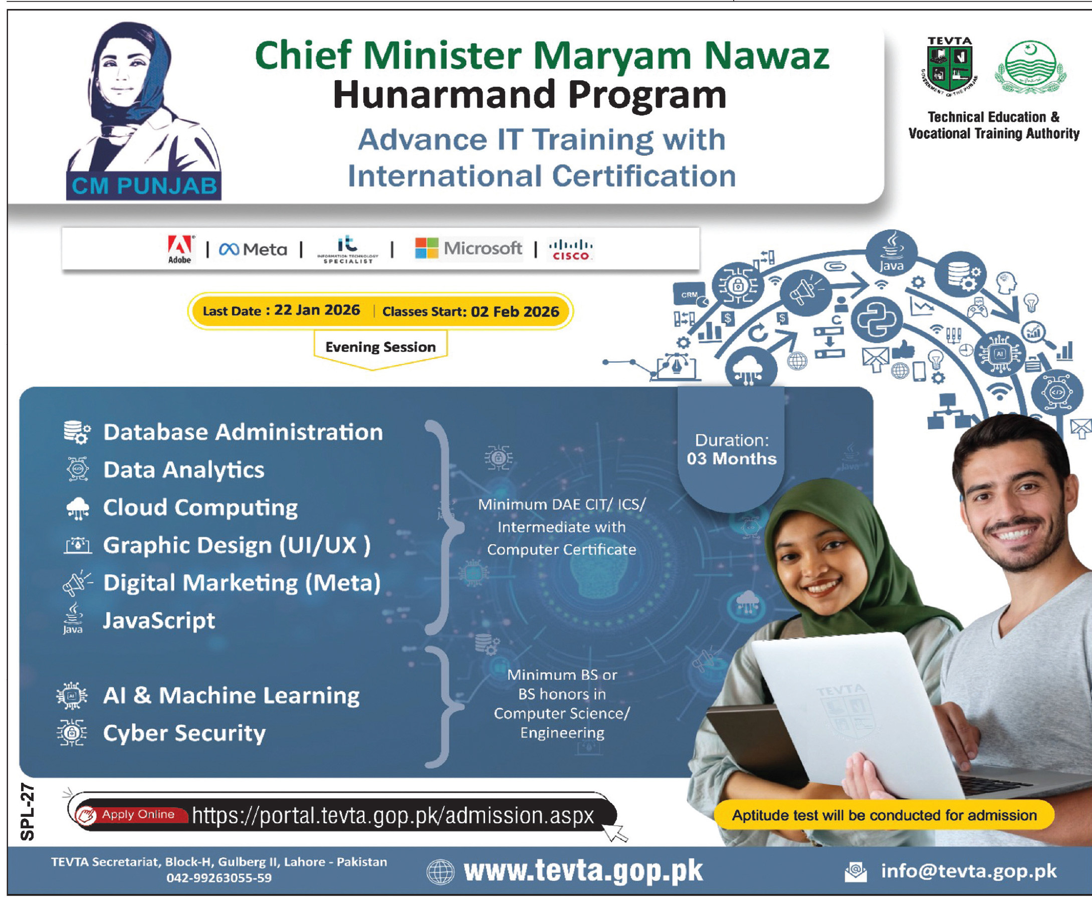 Chief Minister Maryam Nawaz Sharif has launched the next phase of the Hunarmand Program Admissions 2026, specifically aimed at empowering the youth of Punjab with advanced digital and technical skills. This flagship initiative provides free training in high-demand disciplines to foster self-reliance and global employability.
