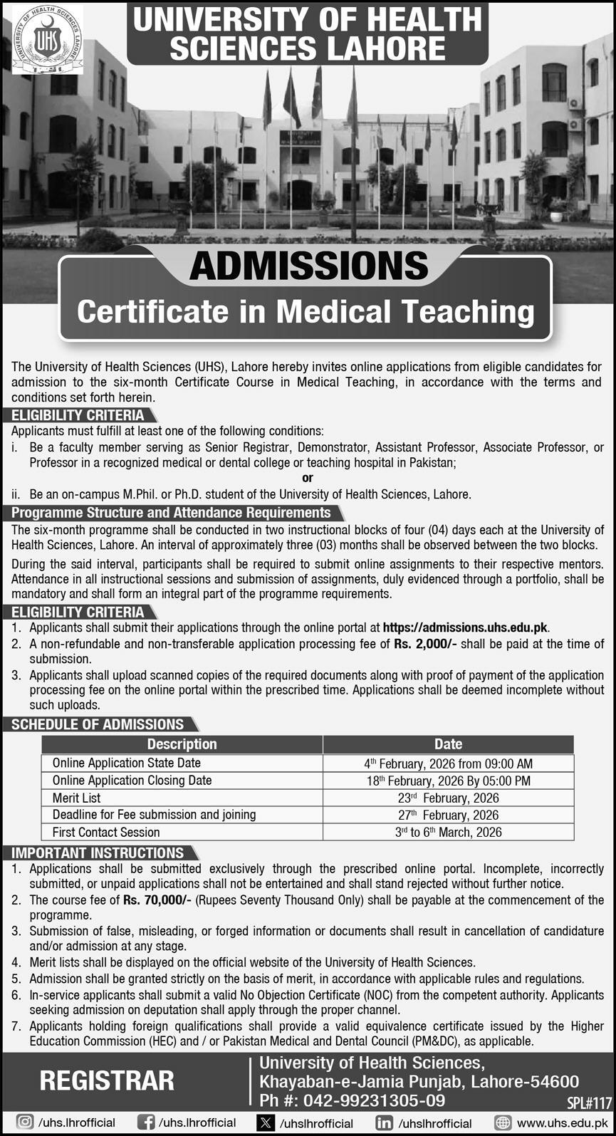 The University of Health Sciences Lahore has officially opened its doors for the 2026 academic cycle, specifically inviting healthcare professionals to enhance their pedagogical skills. As a premier institution in medical education, UHS is now accepting applications for its specialized Certificate in Medical Teaching, a program designed to bridge the gap between clinical expertise and effective educational delivery. This initiative reflects the universitys ongoing commitment to improving the standard of medical instruction across Pakistan.