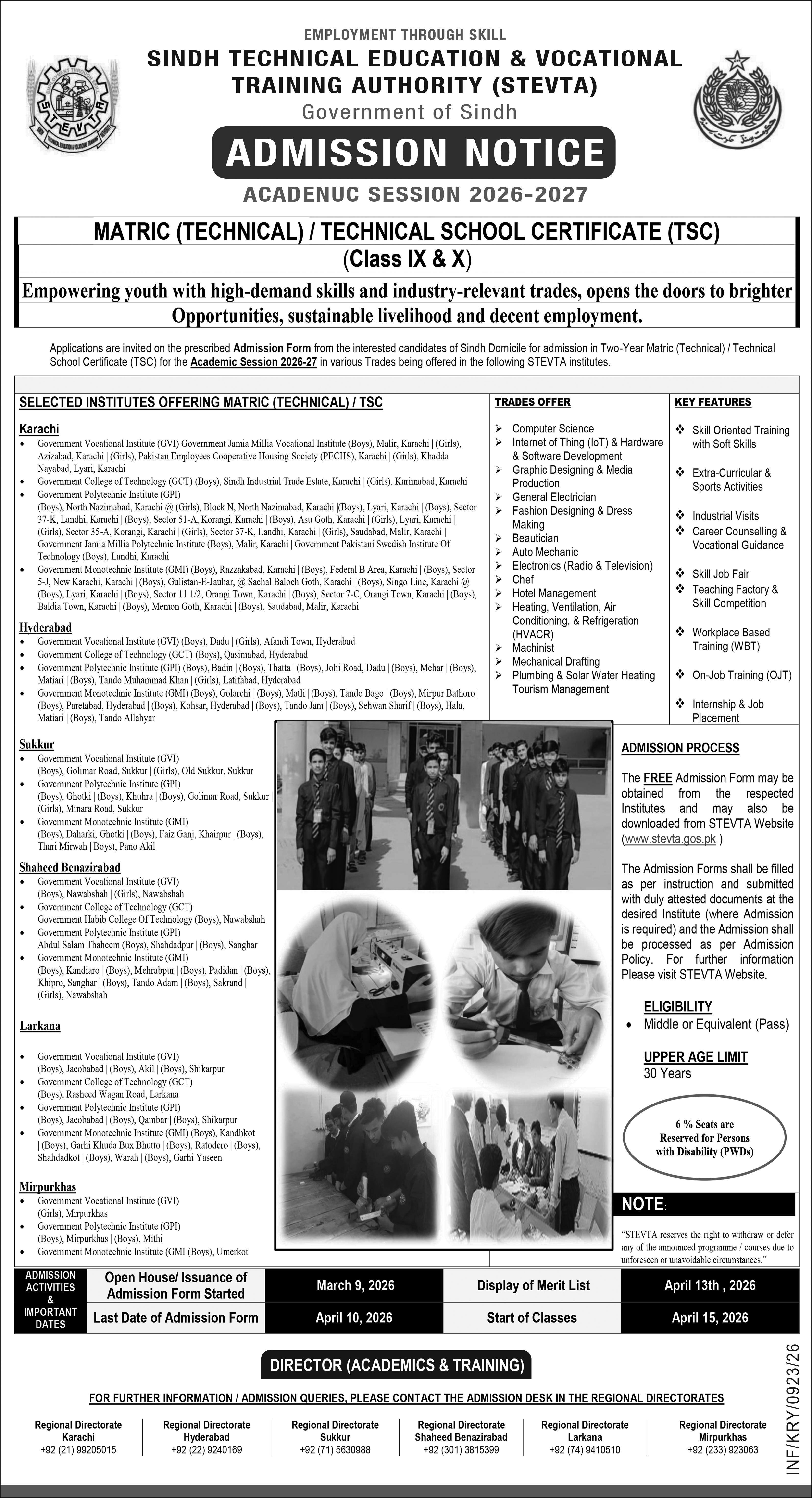 The Sindh Technical Education & Vocational Training Authority STEVTA, Government of Sindh, has announced admissions for the Academic Session 2026–2027 in Matric Technical / Technical School Certificate TSC programs. These programs are designed to provide young students with technical knowledge, practical skills, and industry-relevant training that lead to better career opportunities and sustainable employment.STEVTA is committed to empowering youth with high-demand skills and modern technical education, helping them build successful careers in different industries. Applications are invited from candidates holding Sindh domicile for admission to the Two-Year Matric Technical / TSC program Class IX & X offered at various STEVTA institutes across the province.