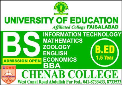 Chenab College Faisalabad, University of Education Affiliated College is intend to open Admissions and seeking for Applications from Interested Candidates for Admissions to BS Degree Programmes in Economics, Zoology, English, Information Technology, Mathematics and BBA. Good and learning environment will be provided to Students. Admissions are open for Session 2021-2022.