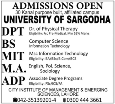 City Institute of Management & Emerging Sciences Lahore has announced admissions for BS in Computer science, Information Technology, DPT Doctor of Physical Therapy, MA in English, Political science, Sociology.