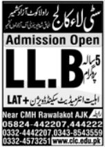 Citi Law College Rawalakot has been announced admissions for LLB 5 year program. Intermediate is eligibility for admission. Admissions are open.