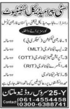 Located at 25-Y Service Road in Multan, City Paramedical Institute CPI provides a conducive learning environment with state-of-the-art facilities and experienced faculty members. This opportunity allows students to gain specialized skills and knowledge, preparing them for a fulfilling career in the medical field. Prospective students can now apply and embark on a journey towards a promising future in the healthcare domain. For more information and to secure your spot, visit the institutes official website and complete the admission process before the deadline.