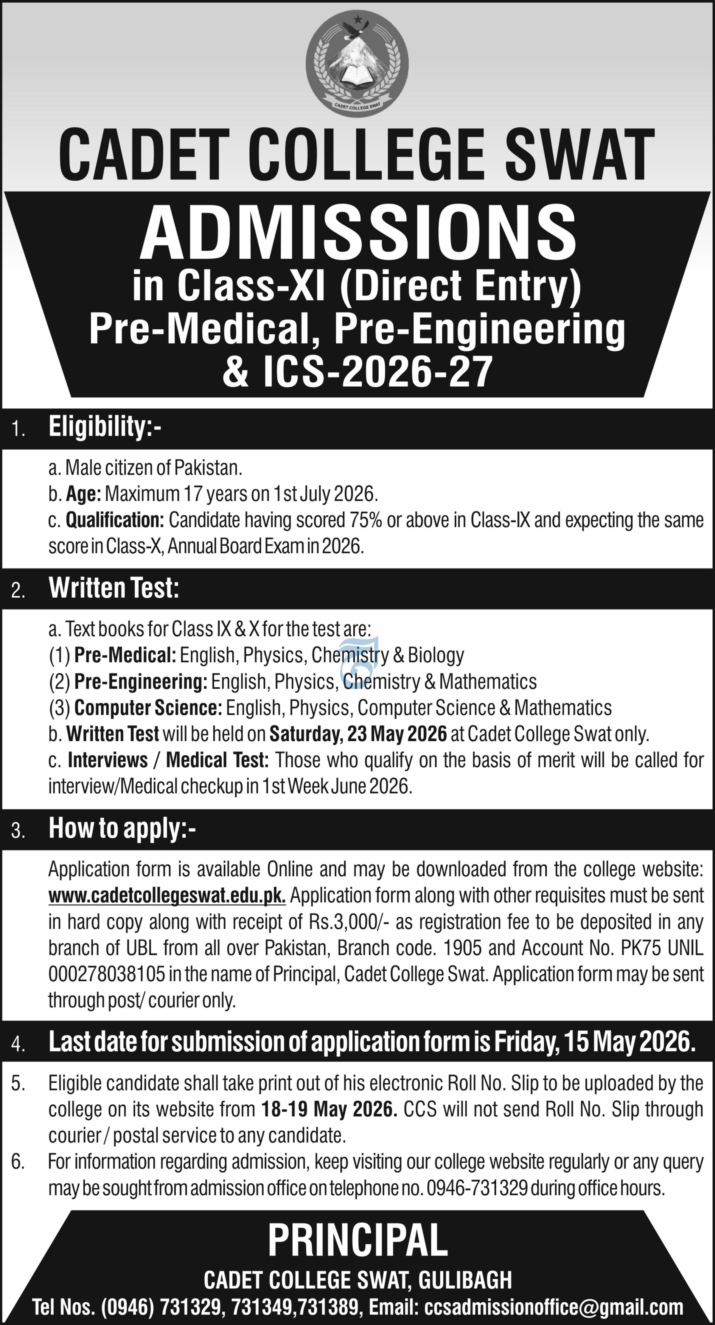 The written test will be conducted on Saturday, 23rd May 2026, at Cadet College Swat only.