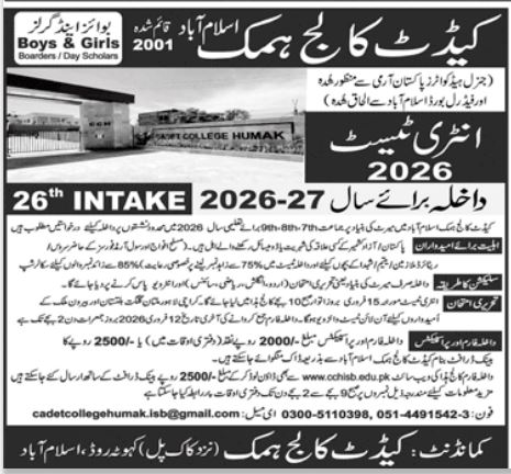 Cadet College Humak, Islamabad, established in 2001, invites applications for admission on merit for the academic session 2026–2027 26th Intake. The college offers admissions to both boys and girls as Boarders and Day Scholars. It is a prestigious institution approved by General Headquarters GHQ, Pakistan Army, and affiliated with the Federal Board of Intermediate & Secondary Education FBISE, Islamabad.
