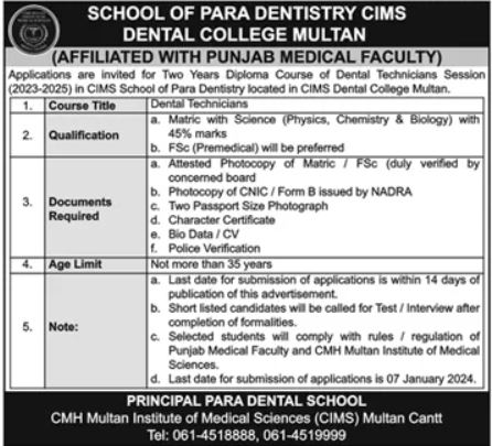 Embark on a journey of dental expertise with the CIMS Dental College, as applications are now open for the Two Years Diploma Course of Dental Technicians Session 2023-2025. This opportunity, provided by the esteemed CIMS School of Para Dentistry in Multan, promises a comprehensive education in dental technology, equipping you with the skills to thrive in this dynamic field.