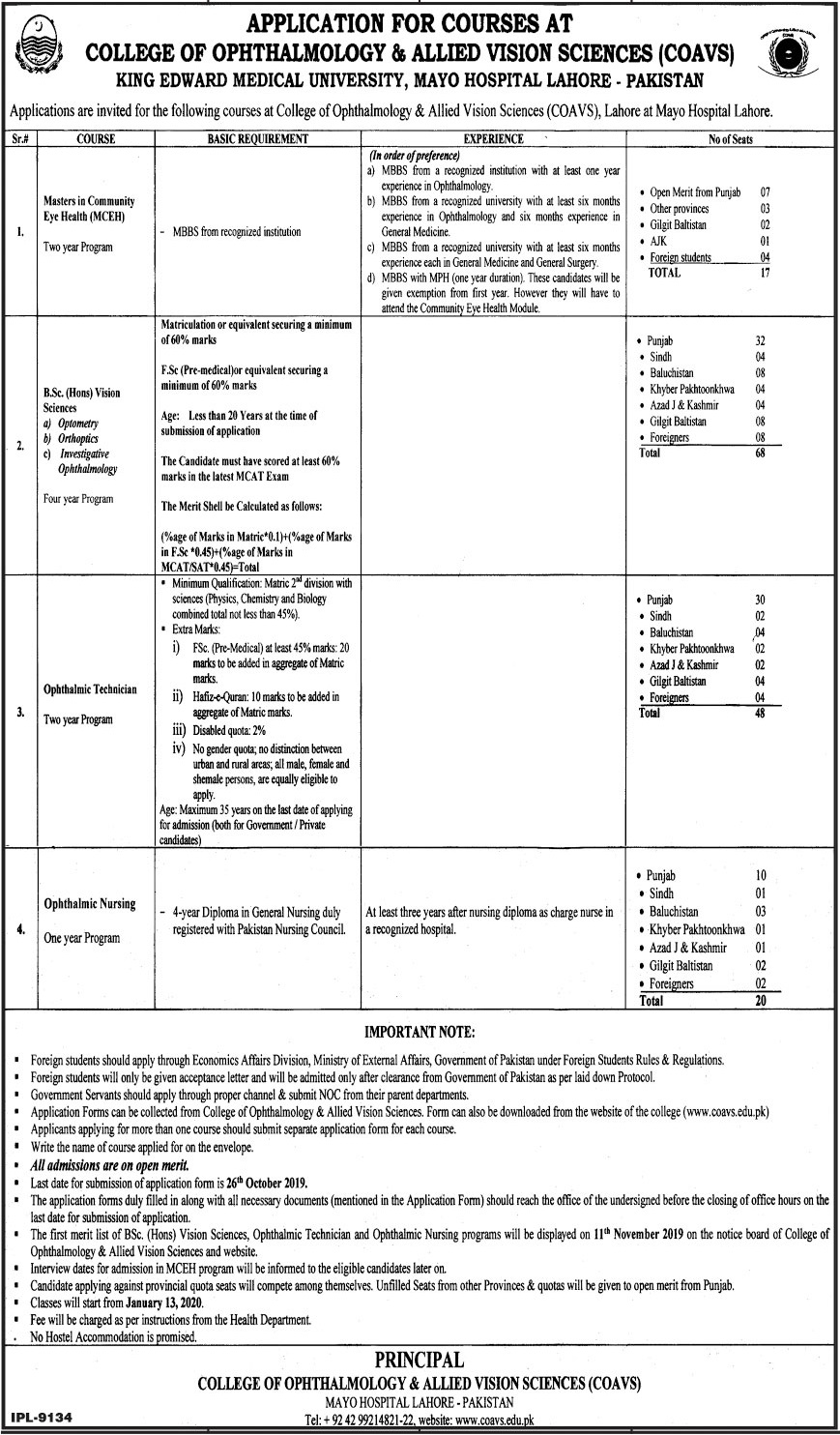 College of Ophthalmology & Allied Vision Sciences Lahore has announced admissions for Masters in Community Eye Health, BSc in Vision Sciences, Courses in Ophthalmology Technician, Ophthalmic Nursing. Last date for submission of admission applications is 26 Oct 2019. Commencement of classes will be on 13 Jan 2020.