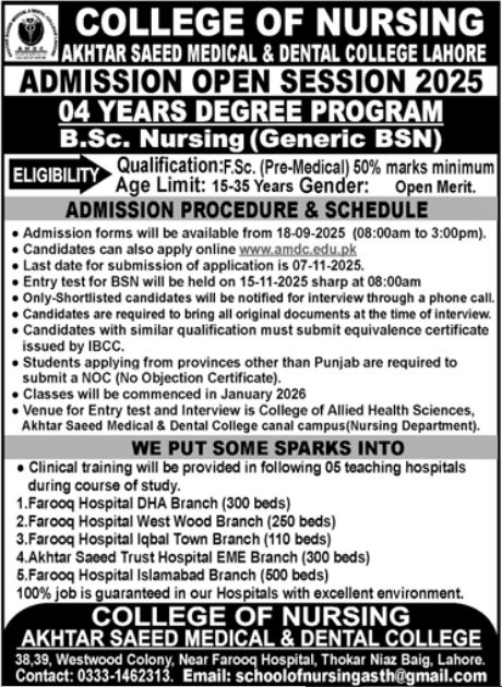 The College of Nursing at Akhtar Saeed Medical & Dental College AMDC, Lahore is now accepting applications for the Generic B.Sc. Nursing BSN program for the 2025 session. This 4-year professional degree prepares students for a rewarding career in healthcare with hands-on clinical training and guaranteed employment.