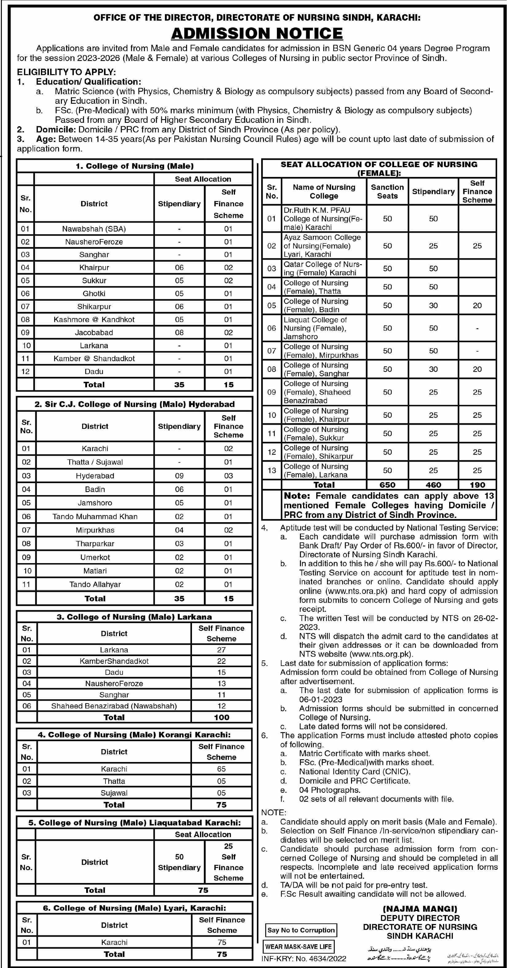 The office of the Directorate of Nursing Sindh Karachi is inviting applicants male and female for admission in various nursing colleges in the province of Sindh for the program BSN Generic. The duration of the program is 4 years and the criteria for the program are Matric with Science from any board in Sindh. FSc Pre-Medical with 56% Marks. Admissions will be given only to the Sindh Domicile Holders. The last date to submit the admission application is 06,1,2023