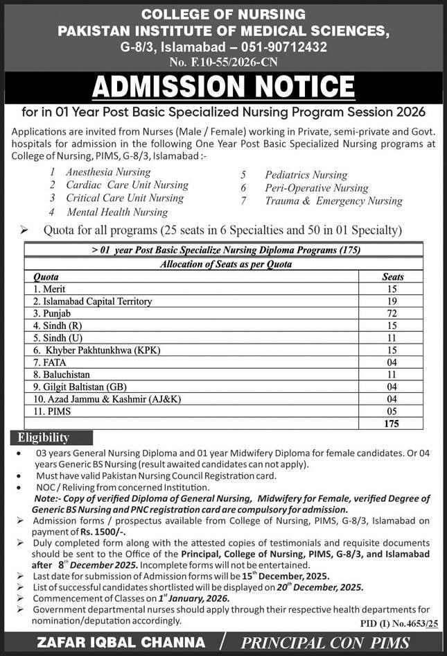 The College of Nursing PIMS Pakistan Institute of Medical Sciences , G-8/3, Islamabad, invites applications from male and female registered nurses serving in government, semi-government, and private hospitals for admission to the One-Year Post Basic Specialized Nursing Diploma Programs for the Session 2026.
