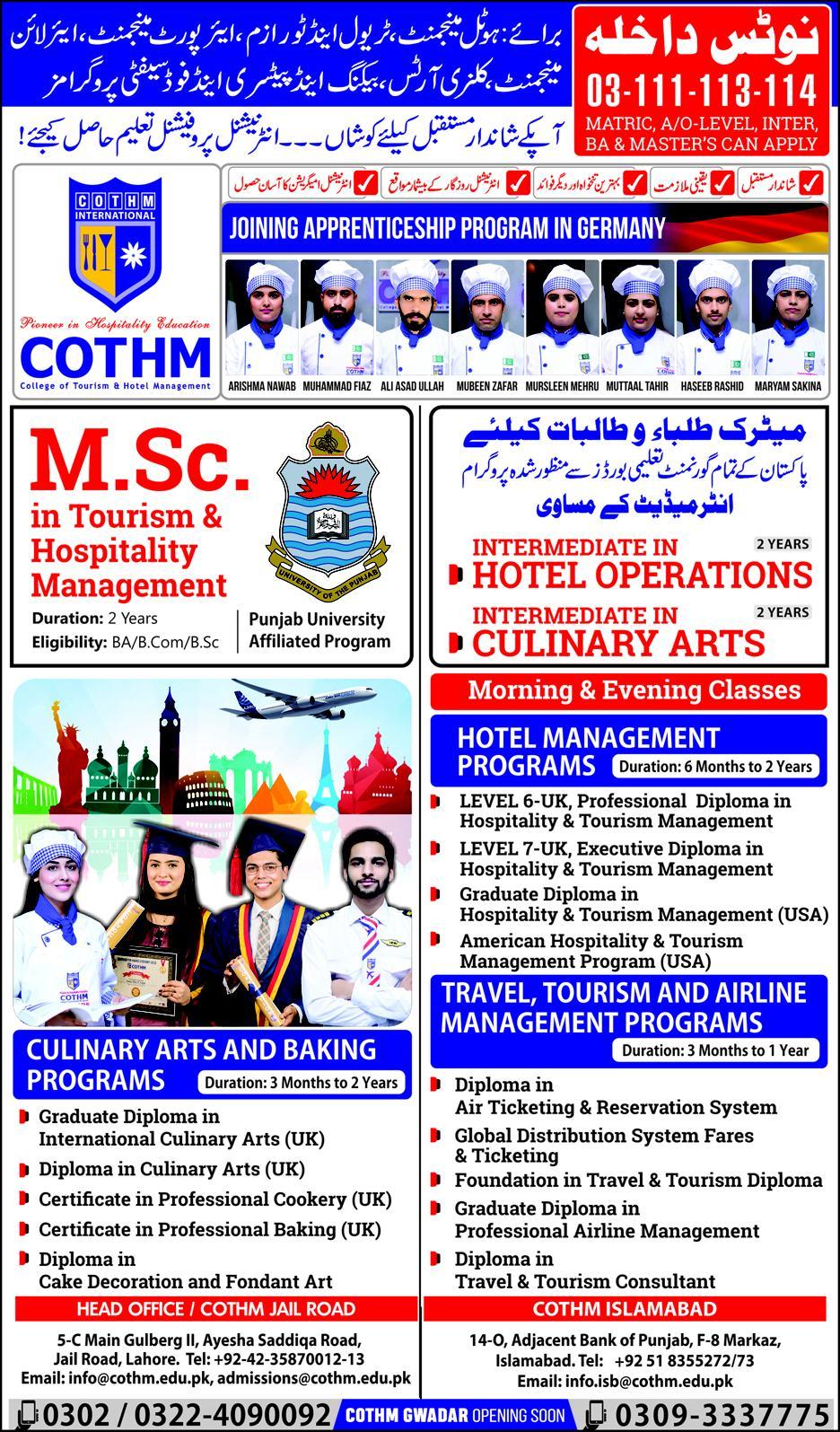 College of Tourism & Hotel Management Lahore affiliated with Punjab University has announced admissions in MSC Tourism and Hospitality Management, Culinary Arts and banking and Travel, Tourism and airline management program, Intermediate in Hotel Operations, Culinary Arts.