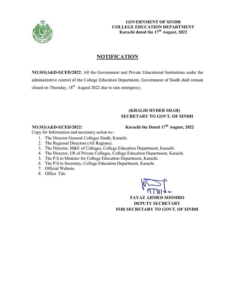 Karachi, College Education Department Karachi has made the announcement that the colleges under the administrative control of College Education Department will remain close on 18-08-2022 due to rain emergency. The students of the colleges will check that CED Karachi Announces Closing of Colleges on 18 Aug and the students will follow them and they will stay at their home as there is rain emergency in the economical hub of Pakistan.