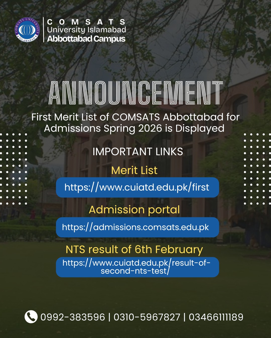 In a competitive academic landscape, this early announcement of the first merit list for COMSATS Abbottabad underscores the university’s commitment to timely communication with prospective students. Candidates urged to act quickly, as further merit lists could follow for waitlisted applicants. Stay informed and ready — your academic journey could begin this Spring 2026 with confidence and clarity.